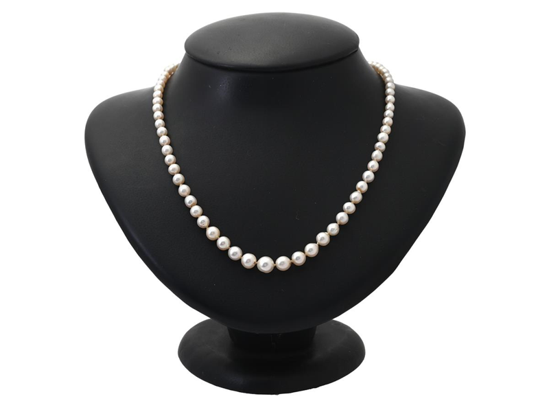 PEARL NECKLACE, cultured pearls, graduated, approx. 3- 6,75 mm, clasp in 18K gold, length 48 cm, weight 13,1 g, safety chain.