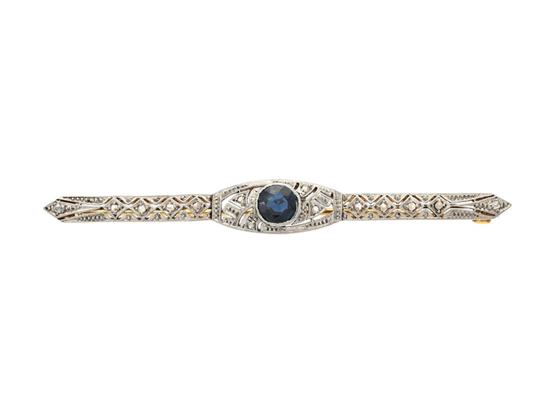 BROOCH, 18K gold/platinum, sapphire, rose cut diamonds, antique, length 65 mm, weight 4,6 g, sapphire with notch.