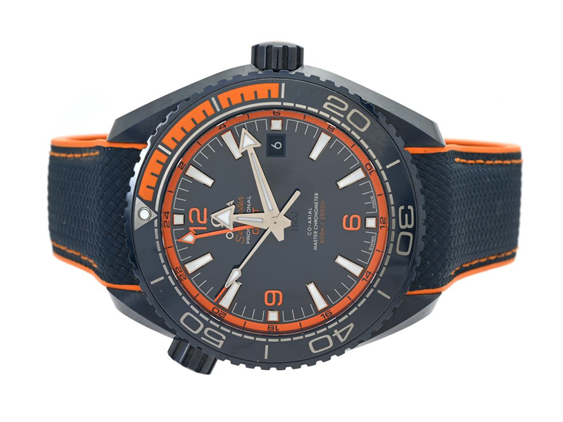 OMEGA, SM (ZrO2), Pro (600m/2000ft), GMT, Planet Ocean 600 M, "Big Blue", Cal 8906, Move no. 89159041, Serial no. 89159041, PIC no. 215.92.46.22.03.001, men´s wristwatch, 45,5 mm, blue ceramics, self win (Co-Axial), sapph crystal, date, blue ceramic bezel (scratches), helium valve, display caseback, rubb strap, fold clasp i titanium/ceramic, cert, April 2018, wooden case, paper box.