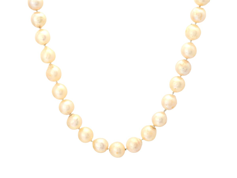 PEARL NECKLACE, cultured baroque salt water pearls approx. 9,0-9,5 mm, clasp in silver, length 43 cm, weight 45,8 g, safety chain in silver.