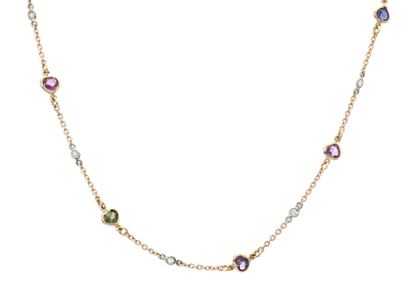 NECKLACE, 18K roséguld/guld, 8 heartshaped sapphires approx. 5,00 ctw, 8 brilliant cut diamonds approx. 0,30 ctw, approx. TW-W/VS, length 41 cm, weight 8,4 g, some sapphires with notches.