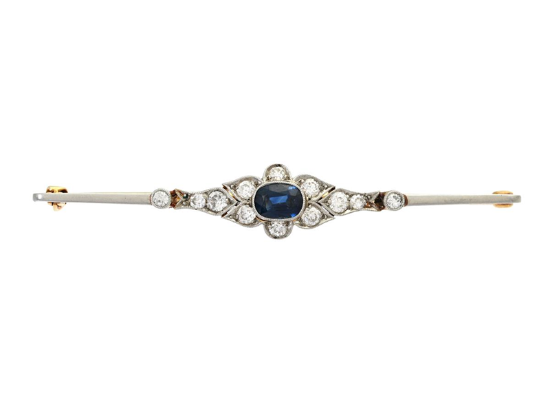 BROOCH, platinum/18K gold, oval-cut sapphire, old European cut diamonds approx. 0,50 ctw, length 60 mm, weight 5 g, one diamond is single cut.