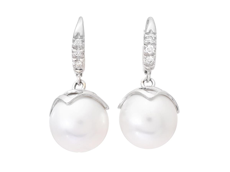 PEARL EARRINGS, 18K white gold, 2 cultured South Sea pearls approx. 12 mm, 6 brilliant cut diamonds approx. 0,09 ctw, approx. W/VS, height 30 mm, weight 8,2 g, hooks with stop.