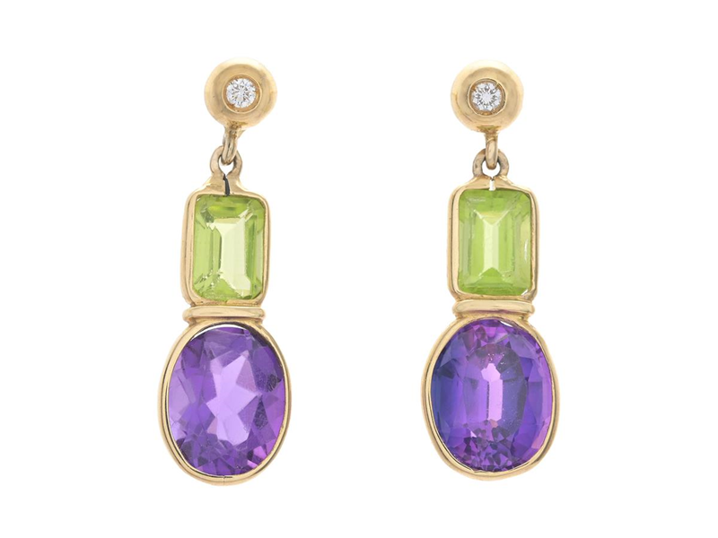 EARRINGS, 18K gold, peridots, amethysts, 2 brilliant cut diamonds approx. 0,06 ctw, approx. TW/VS, height 30 mm, weight 5,3 g, pushback, amethysts and peridots with small notches.