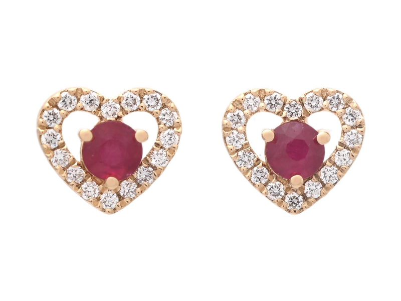 EARRINGS, 18K gold, hearts with rubies 0,15 ctw, 32 brilliant cut diamonds 0,08 ctw, W/SI, pushback