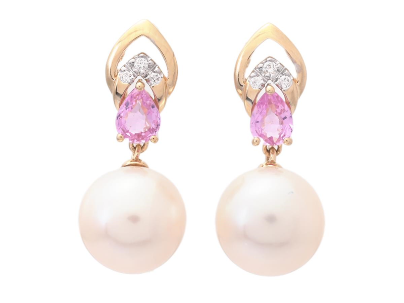 PEARL EARRINGS, 18K gold with 2 cultured freshwater pearls 7,6 mm, 2 pink sapphires 0,32 ctw, 6 brilliant cut diamonds 0,02 ctw, approx. W/SI, pushback