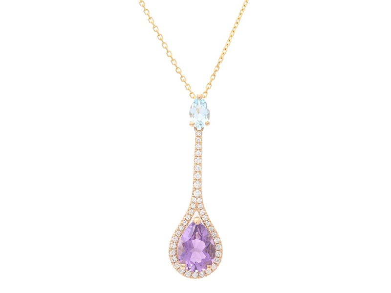 PENDANT/CHAIN, 18K gold, drop shaped faceted amethyst 1,87 ct and topaz 0,45 ct, 38 brilliant cut diamonds 0,24 ctw, approx. TW/VS, the pendant approx. 35,0 mm, length 42/45 cm, weight 4,4 g