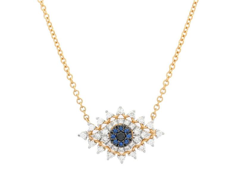 NECKLACE, 18K gold, eye, black brilliant cut diamond 0,03 ct, 8 round faceted sapphires 0,02 ctw, 32 brilliant cut diamonds 0,20 ctw, approx. TW-W/VS-SI, width 16,0 mm, length 40/42 cm, weight 3,3 g.