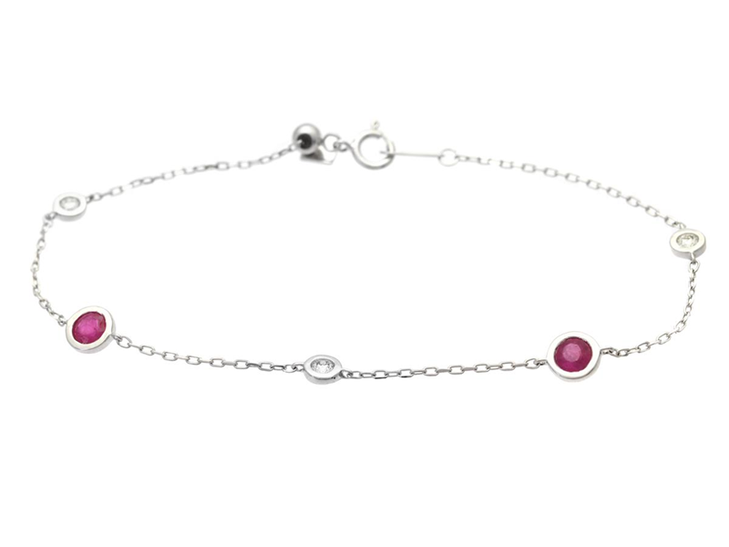 BRACELET, 18K white gold, rubies approx. 0,61 ctw, 3 brilliant cut diamonds approx. 0,16 ctw, length 17 cm, adjustable weight 1,8 g, rubies with small notches and cracks.