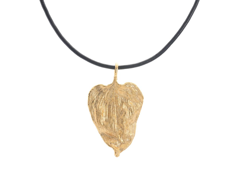 PENDANT, gold plated paper, Bluealg design, measurements approx. 57,0 x 34,0 mm, leather strap with silver clasp, adjustable length, weight 12,8 g.