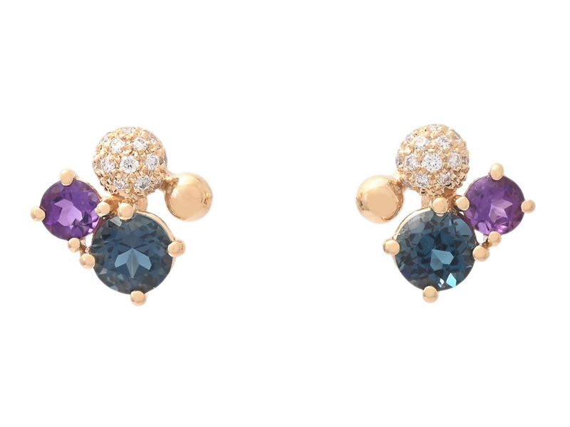 EARRINGS, 18K gold, round faceted topazes 0,67 ctw and amethysts 0,20 ctw, 26 brilliant cut diamonds 0,07 ctw, approx. W/SI, pushback, measurements approx. 7,0 x 7,0 mm, weight 1,7 g.