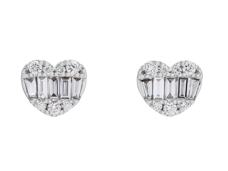 EARRINGS, 18K white gold, hearts, 14 brilliant cut diamonds 0,15 ctw, 6 baguette cut diamonds 0,15 ctw, 4 taper cut diamonds 0,09 ctw, approx. TW-W/VS, pushback, height 6,5 mm, width 7,5 mm, weight 2,3 g.