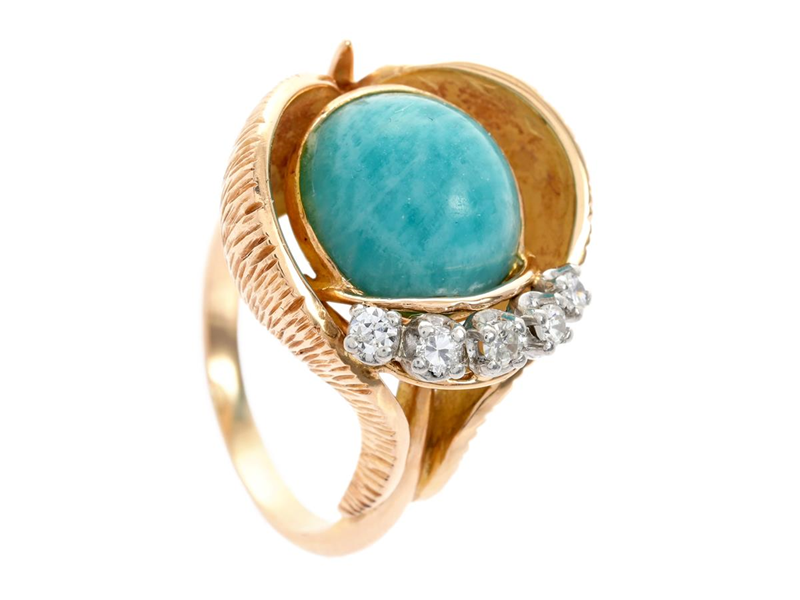 RING, 18K gold, cabochon cut amazonite, single cut diamonds approx. 0,26 ctw W/SI. size 18 mm, weight 12,9 g.