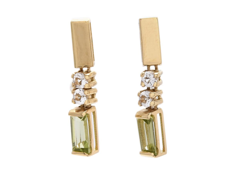 EARRINGS, 18K gold, baguette cut peridots and round faceted white topazes, pushback, length 17,0 mm, weight 1,8 g.