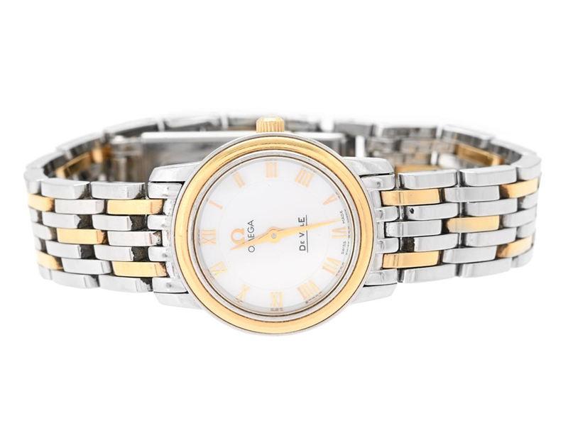OMEGA, The Ville, Prestige, Cal 1456, Serial no. 91350010, PIC no. 4370.71.00, Ref no. 595.1055, Case no. 595.1055, ladies´ wristwatch, 22 mm, steel/gold, quartz, sapphire crystal (scratches), mother-of-pearl-dial, original bracelet, folding clasp, Ref no. 6504/838, length 154 mm, approx. 2011, box.