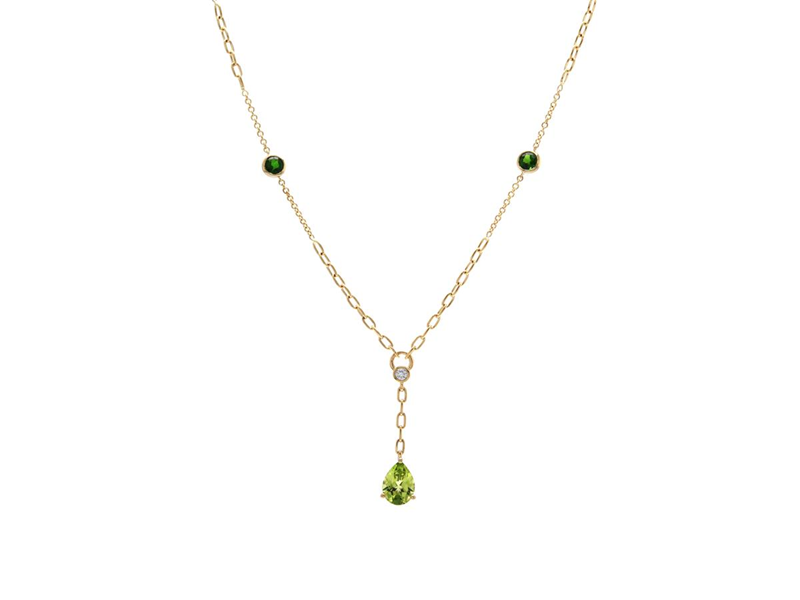 NECKLACE, 18K gold, drop shaped and small round faceted peridots 1,52 ctw, 4 chrome diopsides 0,57 ctw, brilliant cut diamond 0,05 ct, approx. W/VS, length 46+2,5 cm, weight 4,4 g.