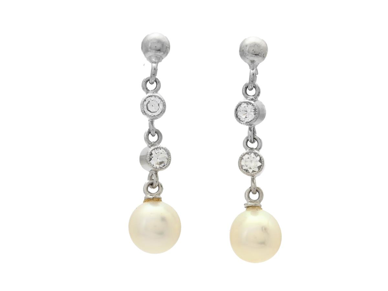 PEARL EARRINGS, 18K white gold, cultured pearls approx. 5,5 mm, synthetic white spinels, height 23 mm, weight 2,3 g, pushback.
