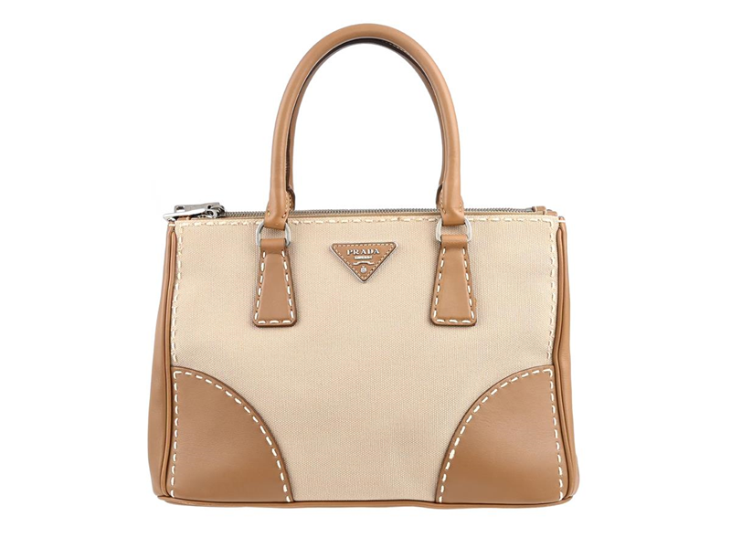 BAG, PRADA, Double Zip Galleria Tote Bag, beige fabric, brown leather, silver-tone hardware, 31x21x13 cm,