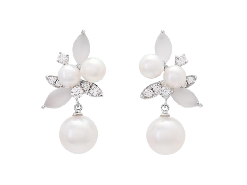 PEARL EARRINGS, 18K white gold, cultured pearls, 12 brilliant cut diamonds approx. 0,23 ctw, approx. TW-W/VS-SI, rock crystal, pushback, measurements 19,0 x 11,0 mm, weight 3,9 g.