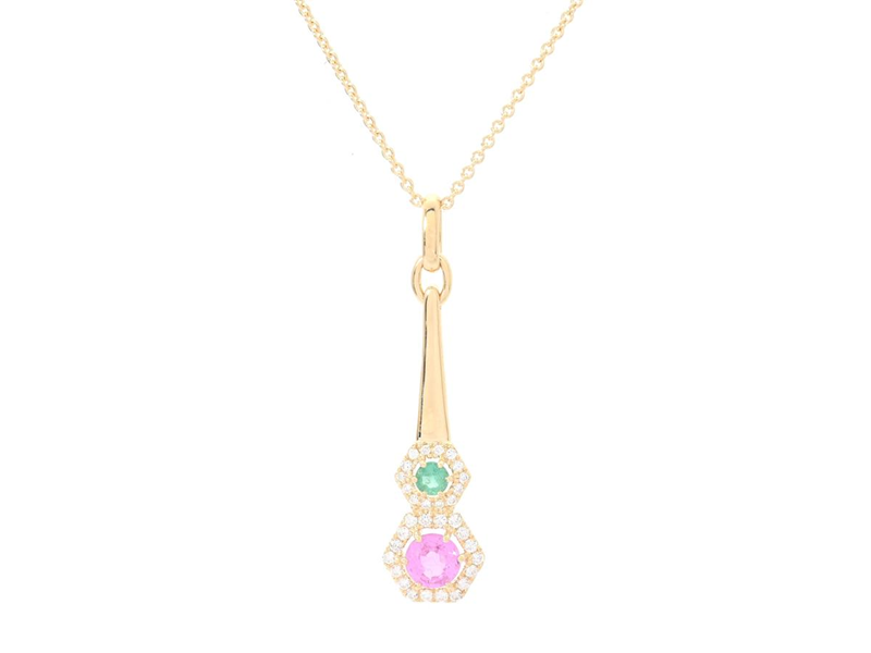 PENDANT/CHAIN, 18K gold, emerald and pink sapphire 0,51 ctw, brilliant cut diamonds approx. 0,12 ctw, approx. TW-W/VS-SI, height 32,0 mm, chain 42 cm, weight 3,4 g.