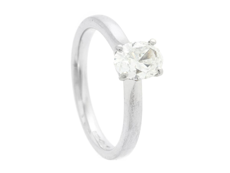 SOLITAIRE RING, platinum, oval-cut diamond 0,70 ct, W(H)/SI1, GIA dossier 5113835335, size 16 mm, weight 4,1 g, the diamond has notches on the pavilion.