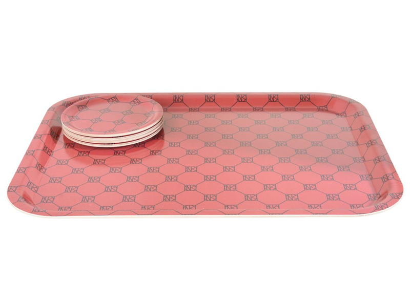 NORDISKA KOMPANIET, NK Collection, red oktagon, tray 36 x 28 cm, coaster 11 cm diameter.