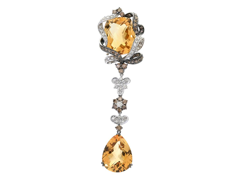 PENDANT, 18K white gold, cushion- and pear shaped citrine approx. 29,38 ctw, 36 brown brilliant cut diamonds approx. 1,18 ctw, 40 brilliant cut diamonds approx. 0,72 ctw, approx. TW-TCa/VS-P, height 80 mm, weight 19,2 g, some diamonds has notches.