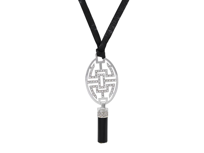 NECKLACE, 18K white gold, leather strap, onyx cylinder approx. 25,0x8,8 mm, 76 brilliant cut diamonds approx. 0,68 ctw, approx. TW-TCr/SI-P, height 80 mm, length 47 cm, weight 22,1 g, a few diamonds has notches.