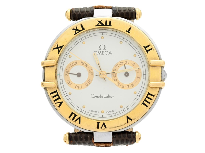 OMEGA, Constellation, s.c. "Uggla", Cal 1444, Serial no. 50798299, Ref no. DB 196.1070, Case no. 196.1070 (LL), men´s wristwatch, 33 mm, steel/gold, quartz, sapphire crystal, day, date, damaged dial, integrated leather strap, approx. 1988.