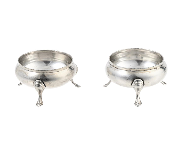 Salt cellars, one pair, sterling silver, on three feet, G Bowens & Sons, Birmingham 1882, height 35 mm, weight 65,0 g.