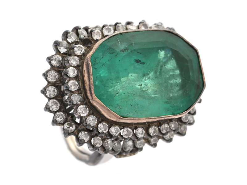 RING, 9K white gold, emerald cut emerald approx. 19,5 ct, diamonds approx. 0,75 ctw, approx. W-Ca/VS-P, size approx. 16,5 mm, weight 12 g. one stone missing, several stones with damages and notches, somewhat skew ringshank.