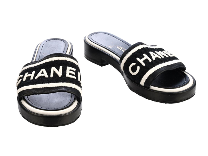 SHOES, CHANEL. Slip-in sandals, black leather, fabric, white, black, Logo, heel 3,5 cm, size 37½, dustbag, box, light signs of wear.