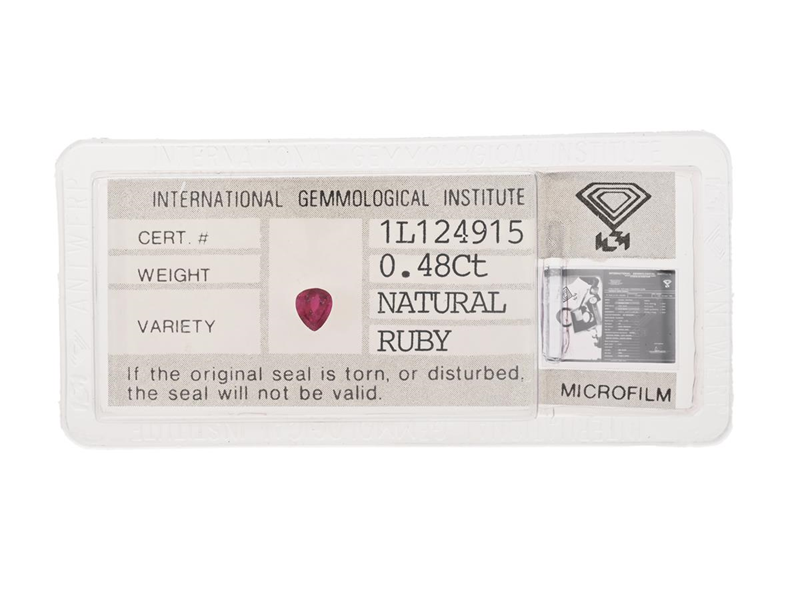 RUBY, pear shaped, 0,48 ct, measurements 4,8 x 4,1 x 2,9 mm, IGI certificate 1L124915, sealed.