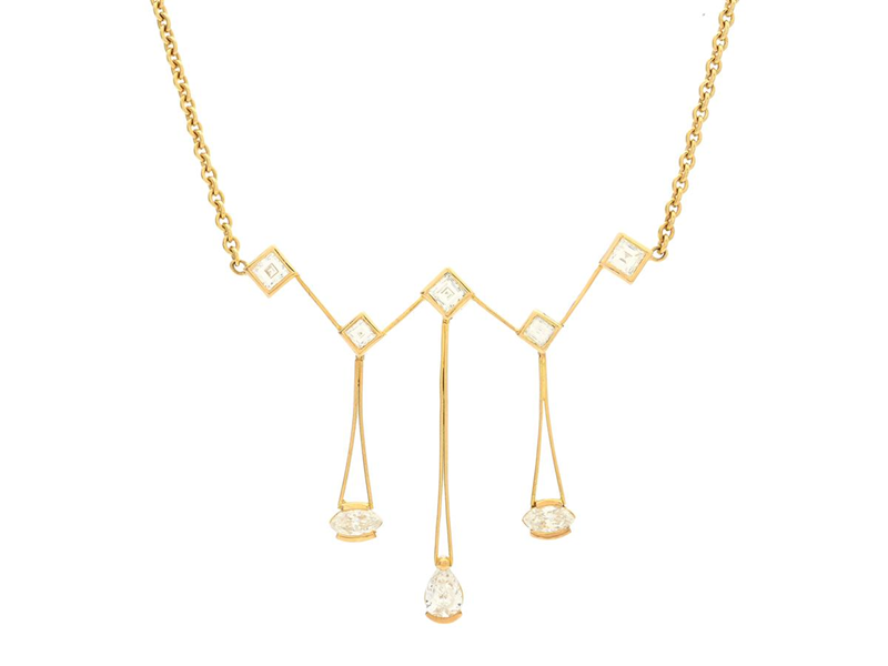 NECKLACE, 18K gold, pear shaped diamond, 2 marquise cut diamonds and 5 carré cut diamonds approx. 0,90 ctw, approx. TW/VS, length 43 cm, weight 6,5 g