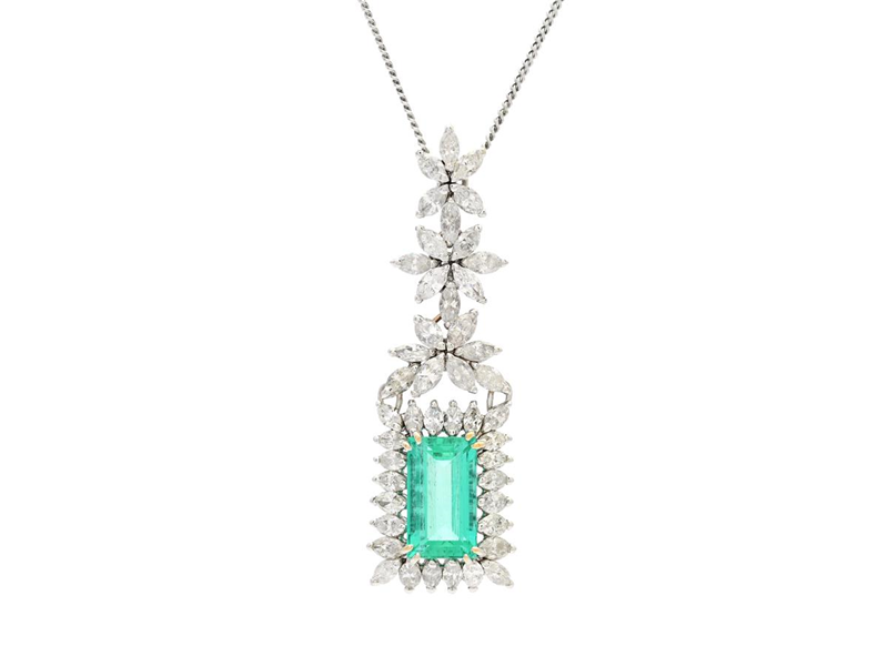 PENDANT/CHAIN, 14K white gold, chain in 18K white gold, baguette cut Colombian emerald 3,21 ct, marquise cut diamonds approx. 3,00 ctw, approx. R-Cr/P, height 45 mm, length 46 cm, weight 9,4 g, emerald has small notches and inclusions that reach the surface, a few diamonds has notches.
