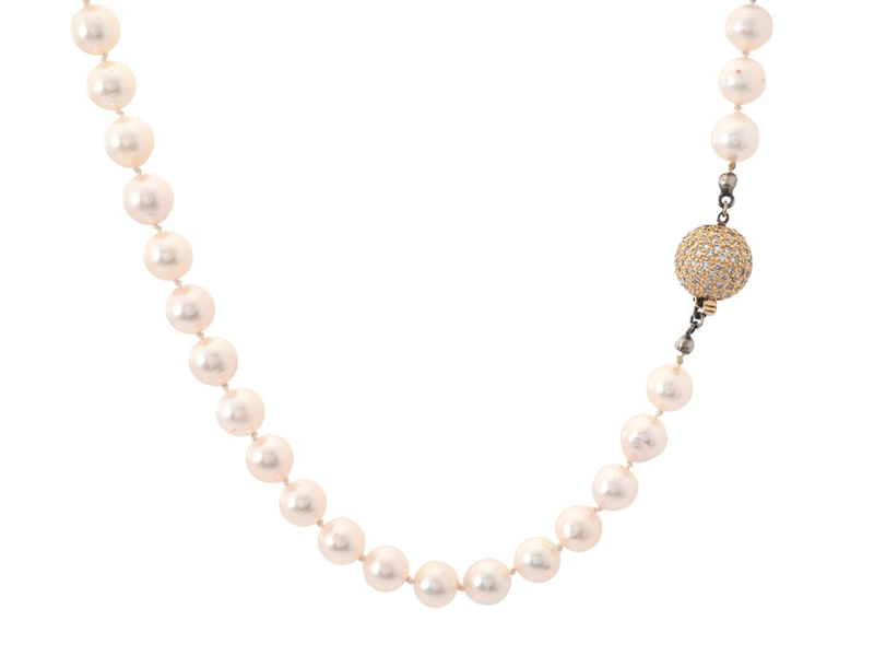 PEARL NECKLACE, cultured pearls approx. 8,0 -8,25 mm, clasp in 18K gold, brilliant cut diamonds approx. 1,00 ctw, approx. W/VS-SI, diameter 13 mm, length 49 cm, weight 43,0 g, fragile pearl silk.