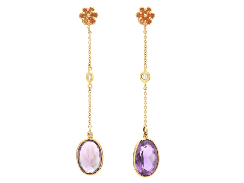 EARRINGS, 14K gold, 2 oval cut amethysts, 2 brilliant cut diamonds approx. 0,10 ctw, approx. TW/P, height 65 mm, weight 6,0 g, pushback,