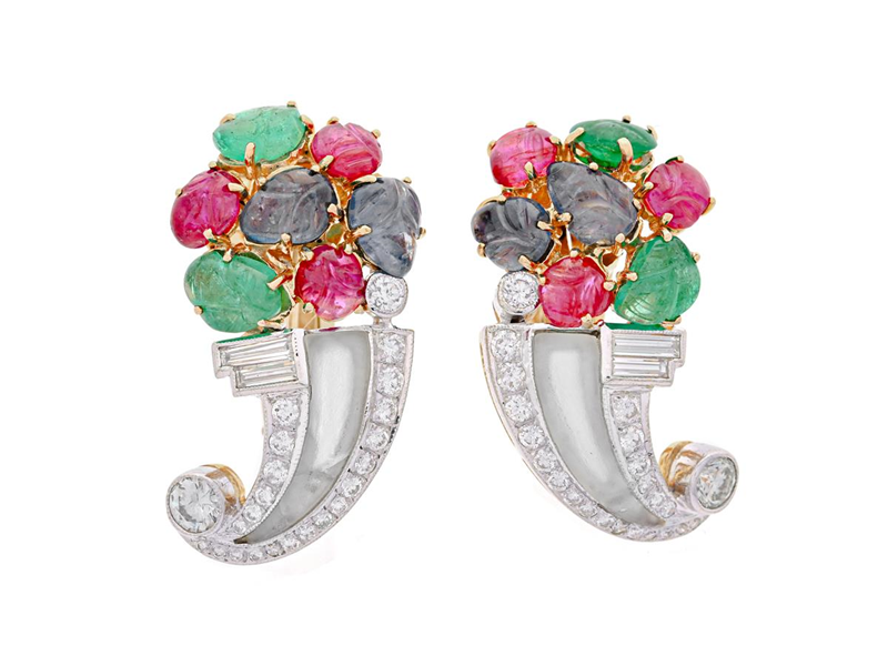 EARRINGS, 18K gold/white gold, carved frosted rock crystal, carved leaf of emeralds, sapphires and rubies, brilliant- and baguette cut diamonds approx. 1,00 ctw, approx. TW-Ca/VS-P, height 28 mm, weight 15,1 g, pushback with clips, can be worn as clips, the rock crystals are damaged.