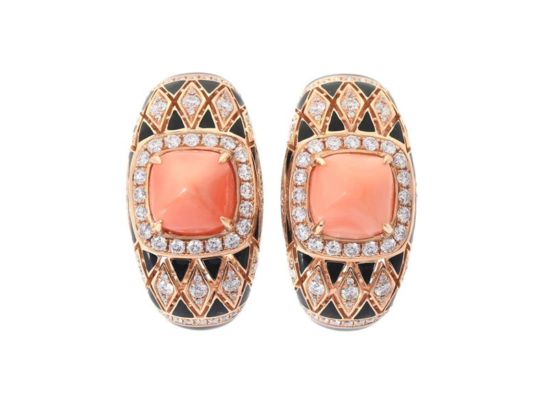 EARRINGS, 18K rose gold, coral, black enamel, 152 brilliant cut diamonds approx. 1,34 ctw, approx. TW-W/VS, height 24 mm, weight 13,6 g, stift/clips.