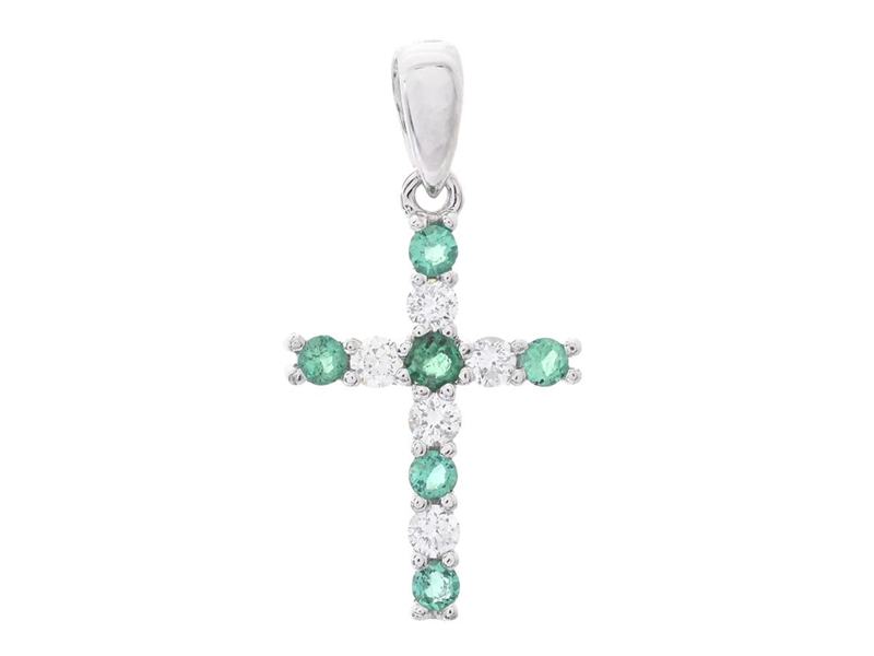 PENDANT, 18K white gold, cross, 6 round faceted emeralds approx. 0,10 ctw, 5 brilliant cut diamonds approx. 0,09 ctw, approx. W/SI-P, height 13,0 mm, width 9,0 mm, weight 0,4 g.