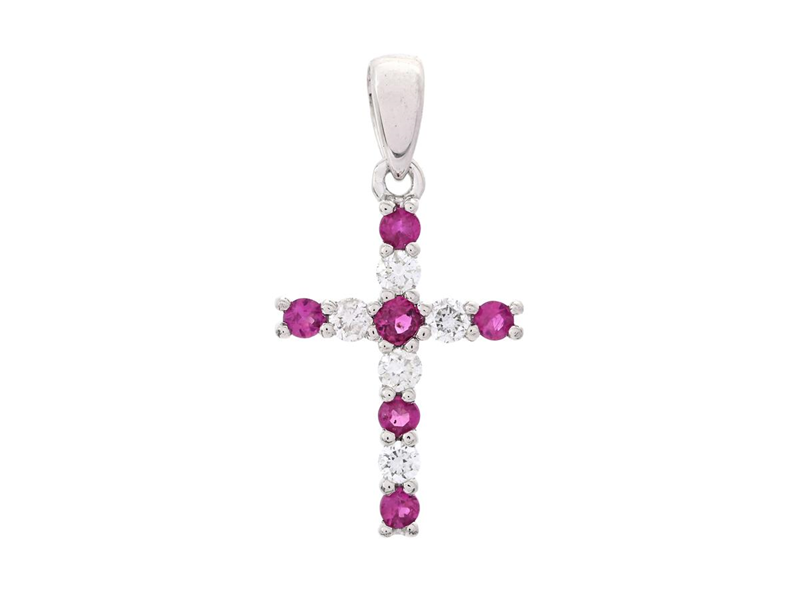 PENDANT, 18K white gold, cross, 6 round faceted rubies approx. 0,12 ctw, 5 brilliant cut diamonds approx. 0,09 ctw, approx. W/SI-P, height 13,0 mm, width 9,0 mm, weight 0,5 g.