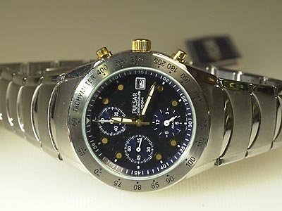 PULSAR, kronograf, herrur, stål, quartz, mineralglas, datum, alarm, integrerad länk, oanvänd, box.