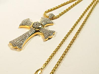 1 HÄNGE i form av ett kors i 18K guld med 187 st briljantslipade diamanter ca 3,00 ct totalt ca TW-W/VS-SI, vikt 14,3 g, ca 5x3 cm: 28 000 Kr/42 000 Kr. 1 Kedja i 18K guld, fantasilänk, vikt 10,8 g, längd 44 cm: 2 200 Kr/3 300 Kr.