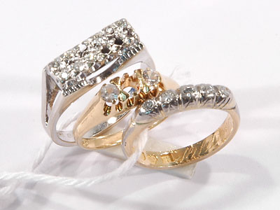 3 Ringar, en med stenar/en sten saknas graverad, två med diamanter 5xca 0,02ct 7xca0,01ct/fem stenar saknas 18K Ø16-18 14,2g