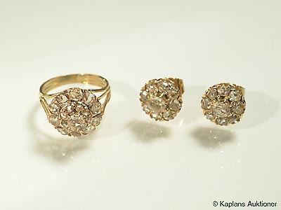 RING, ÖRHÄNGEN, 18K guld med rosenslipade diamanter, vikt 8,2 g, ca K-M/SI-P, stl 17, stift