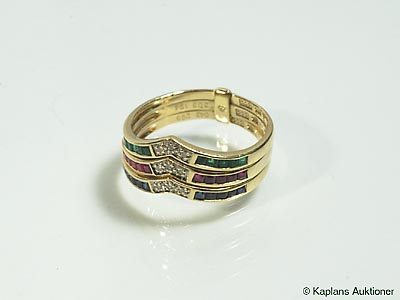 RING, 18K guld, (3 sammansatta ringar) 9 briljanter ca 0,05 ctv, + smaragder, safirer och rubiner, stl 17 3/4, V=4,7g.