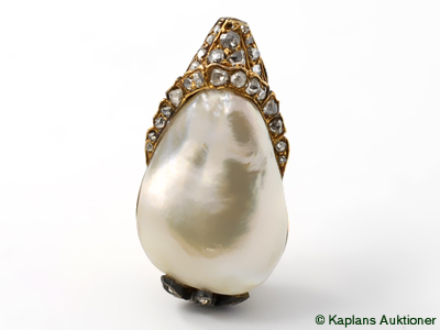 BROSCH, 14K guld / silver med orientalisk pärla och rosenslipade diamanter, längd 2,5 cm, antik