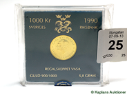 1 Minnesmynt "Regalskeppet Vasa 1990", nominellt värde:1000sek, 21,6K, etui. Vikt 5,8g