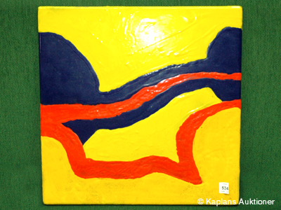 1 Tavla i metall med emalj, gul/röd&blå ton, bär spår utav signatur ca 50x50cm (d)