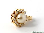 HÄNGE, 18K guld med 9,6 x 8,5 mm odlad boutonpärla omgiven av 12 briljanter ca 1,60 ct totalt, ca Top Cape/VS, vikt 5,4 g.
